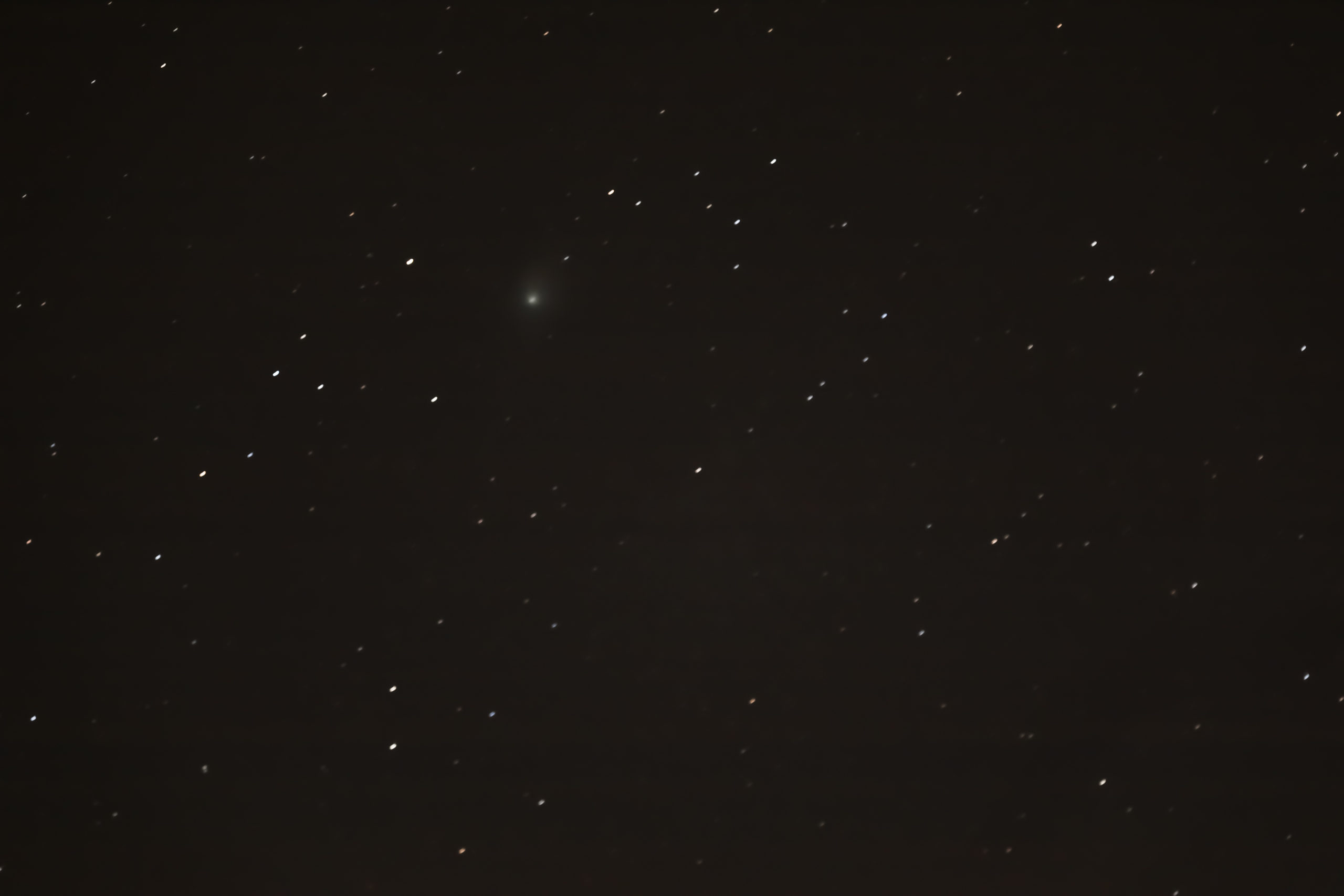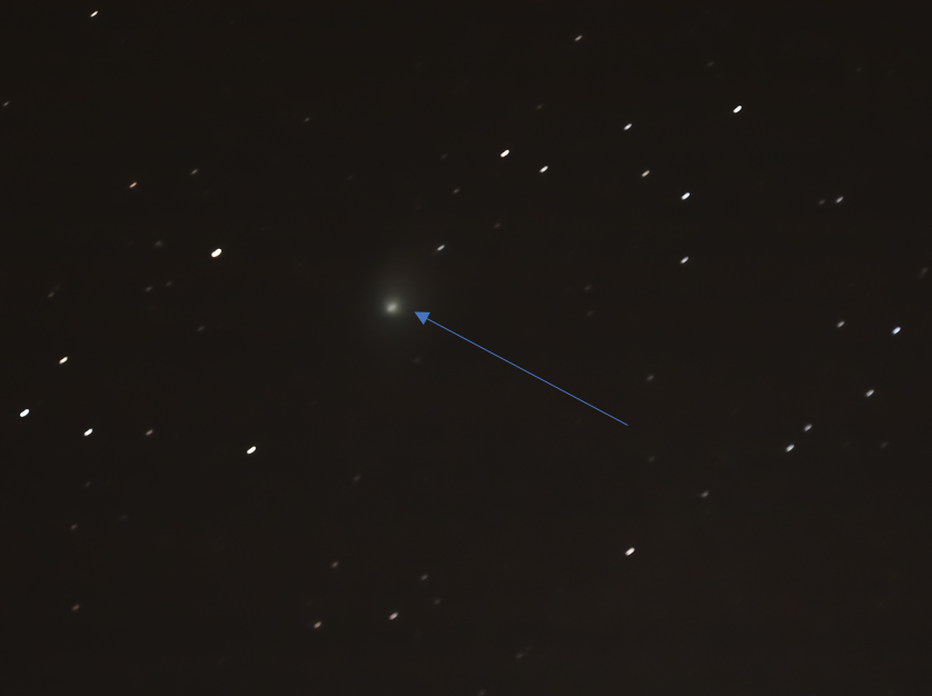 The photograph lacks clarity of the Comet Neowise images I took in July 2020. The smudged area of the picture (highlighted by the arrow in the second image) is the comet. As it travels closer to the Sun, its surface ice melts into gas, and dislodges dust, creating the cloud around the comet and its tail. I located C/2022 through binoculars, before lining up the camera. The comet was so indistinct that it was impossible to see through the camera lens, and I only knew it was in the picture when I reviewed after taking.