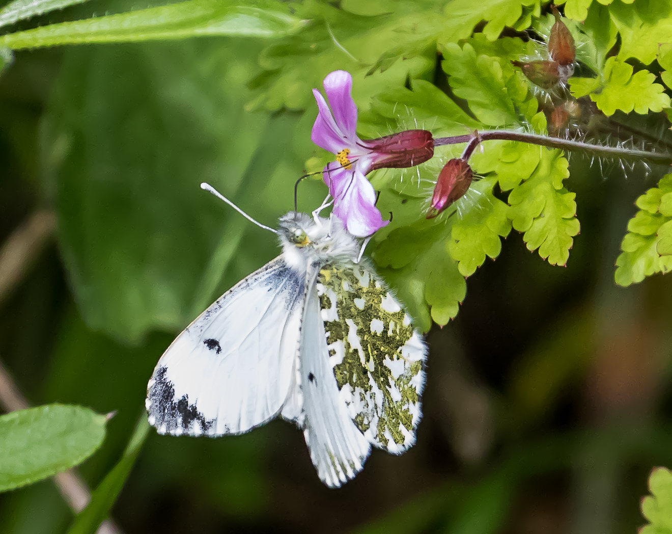 Females have similar markings to the males, but have black wing tips in place of orange. Both female and male have mottled green underwings. Other white butterflies look similar to female orange-tips, but lack the moss green underside to the wings.