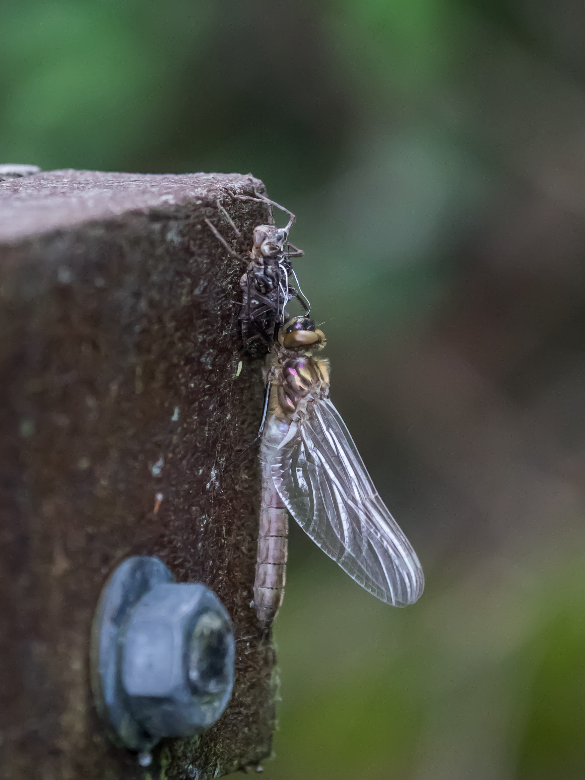 Dragonflies do not have a pupal phase, transitioning instead straight from larva to adult. In preparation for emergence, the larvae wait in shallow water for a few days. This allows them to begin to breathe air, before they find an elevated position from which to commence the final stage.